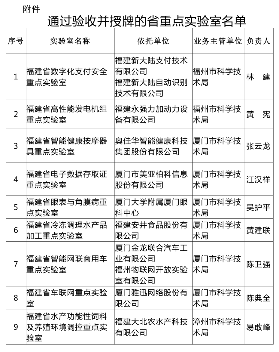 根据《福建省重点实验室管理实施细则》,我厅组织对18家省重点实验室(企业类)开展了验收工作。根据验收专家组意见,经研究决定,福建省数字化支付安全重点实验室等18家重点实验室(具体名单附后)通过验收,予以正式授牌运行。为确保实验室建设水平和质量,现将有关事项通知如下: